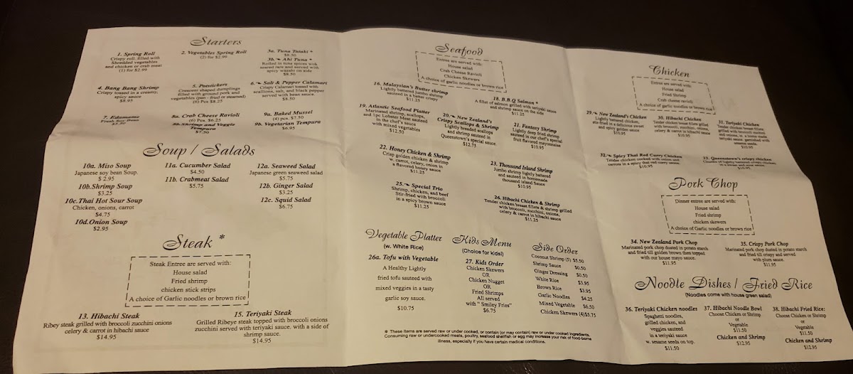 1st time here. Seated at a high top table. 1st pic is New Zealand chicken with rice, 2 fried shrimp, salad and crab cheese ravioli for 11.25 USD. 2nd pic is Hibachi steak, rice, salad, and 2 chicken strips for 14.95 USD. 3rd pic is spring roll for 2.99 USD. Lots of food for amazing price. Service excellent. Recommend!